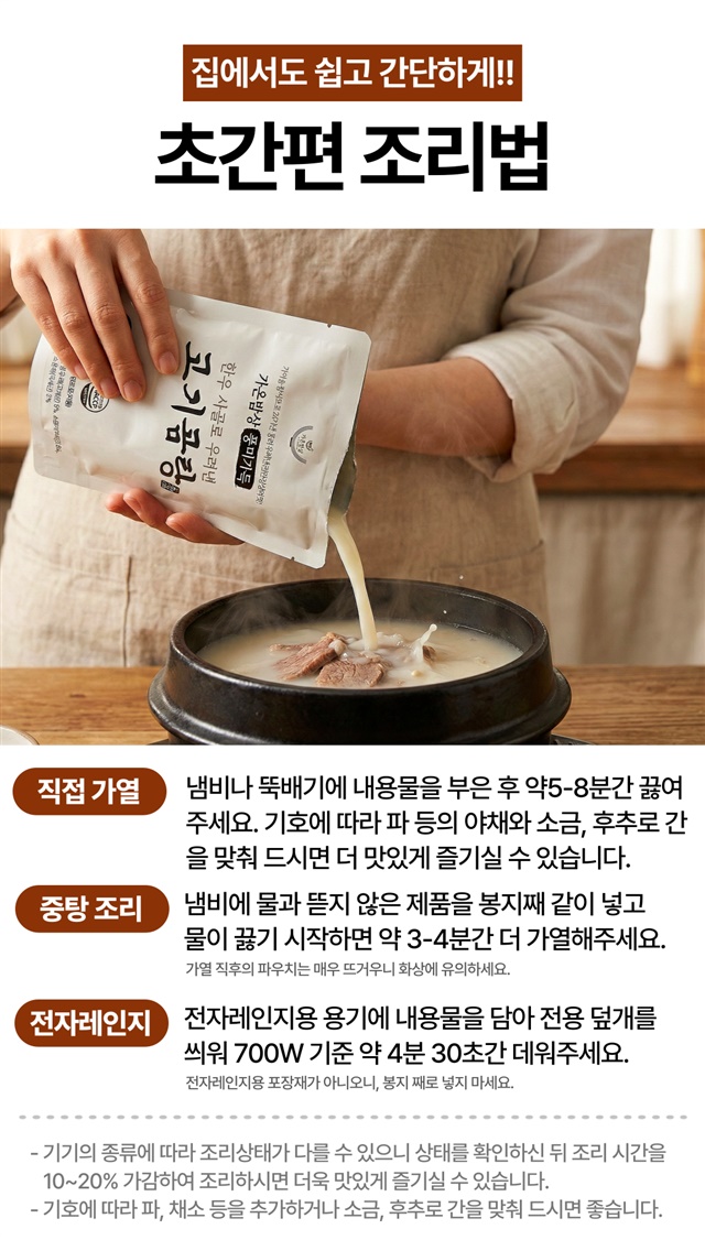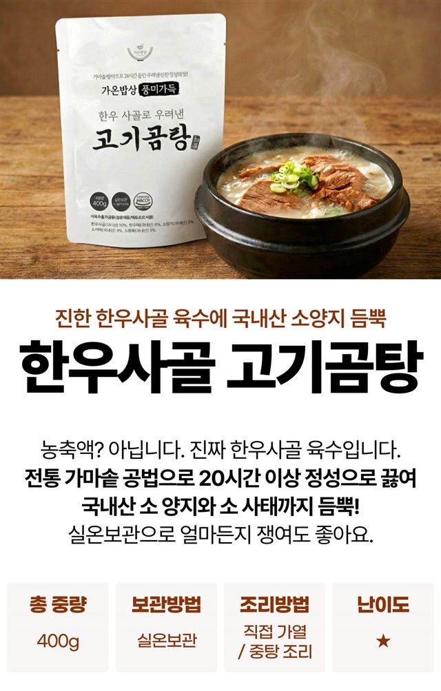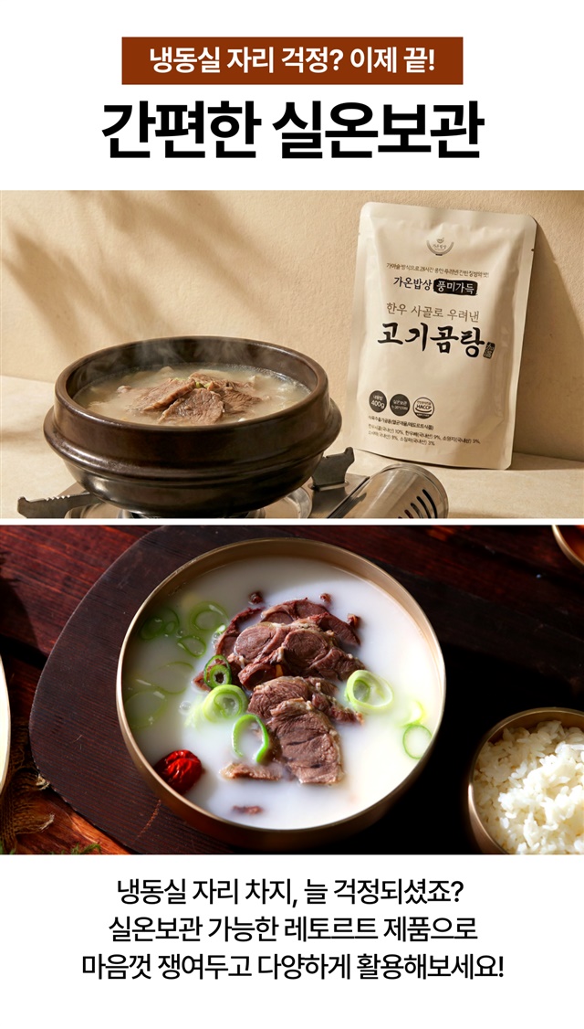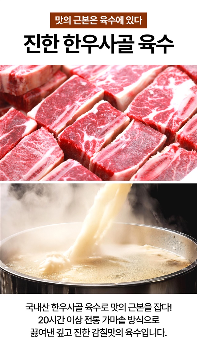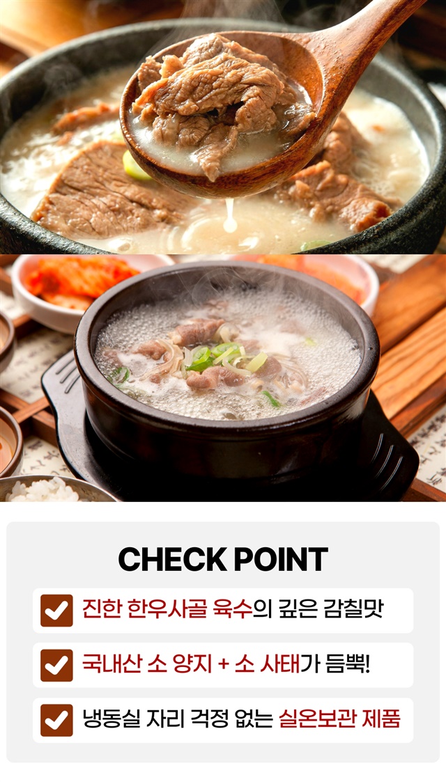 두번째 구매했어요. 지난번엔 그냥 밥에 먹기도 하고, 소면 토렴해서 맛나게 먹고, 이번엔 새해 떡국을 곰탕 베이스로 맛있게 끓여 먹었습니다. 고기도 많이 들어있고, 간도 딱 맞아요. 곰탕 3팩에 떡 4인분 넣고, 달걀지단, 김 고명 얹으니 맛난 새해 떡국 입니다~~재구매 의사 10000000프로 입니다. ^^