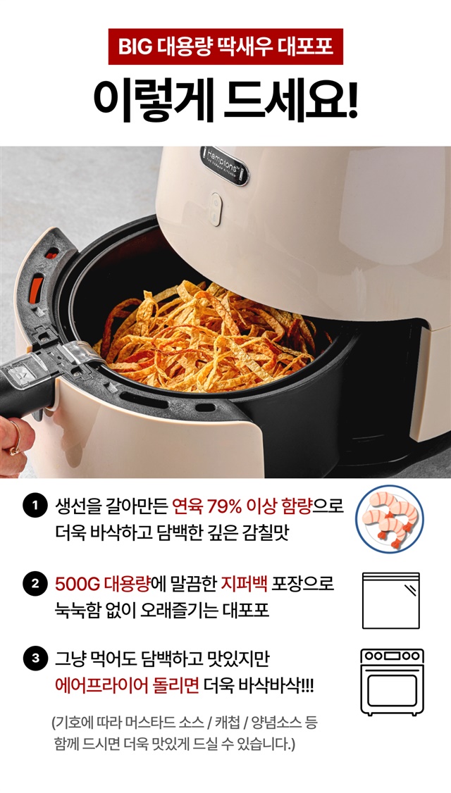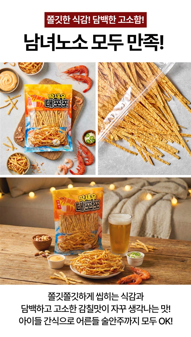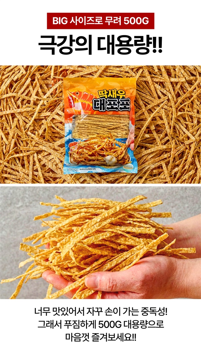 양 진짜 많네요ㅋ 짜지않고 쫄깃하고 자꾸만 손이가요ㅋ 그냥 먹으면 부드럽고 에프에 1분정도 넣었다 빼니 파사삭한 고급진 새우깡맛이나고 두배는 더 맛있어지네요