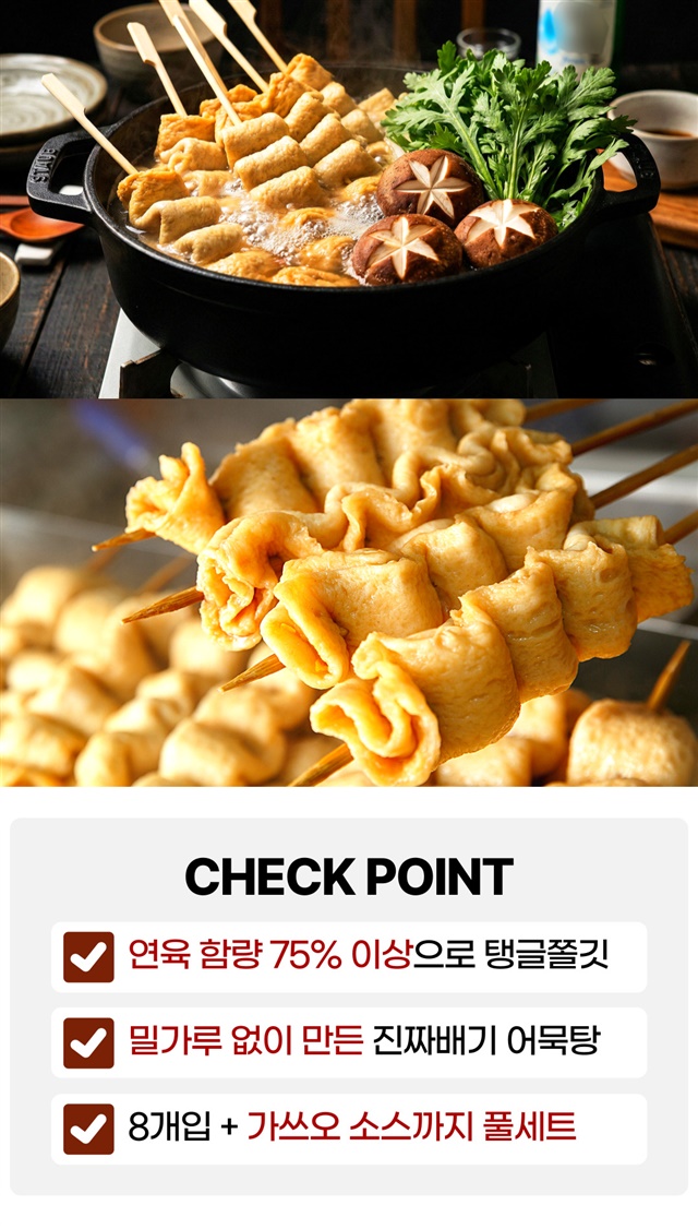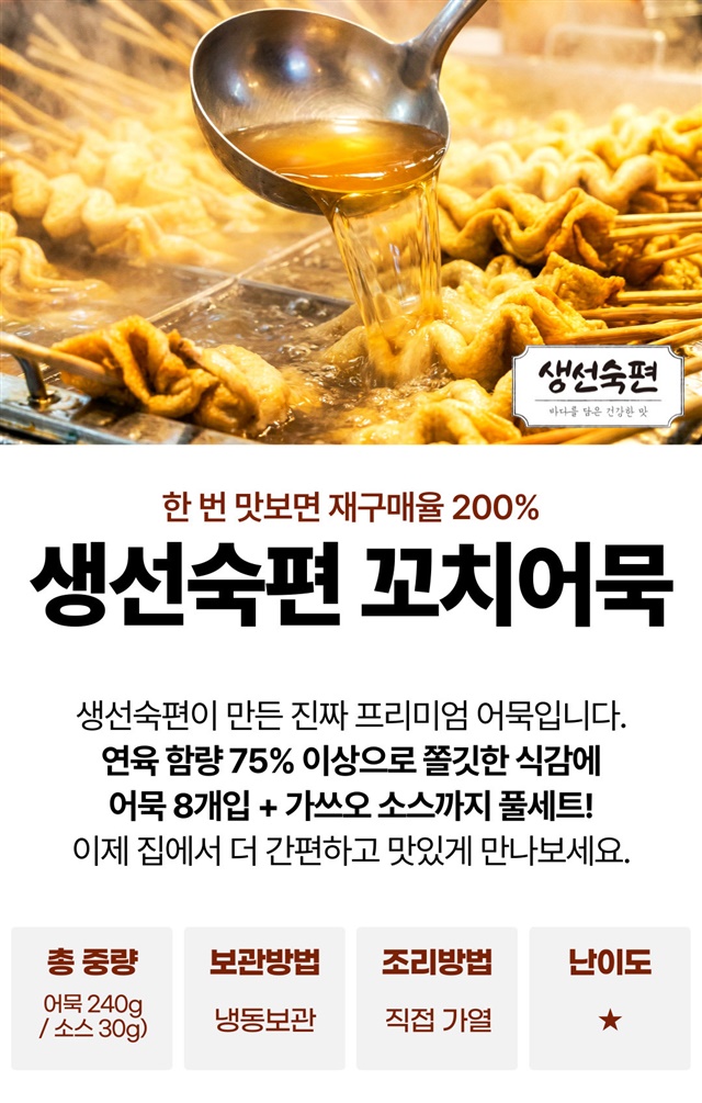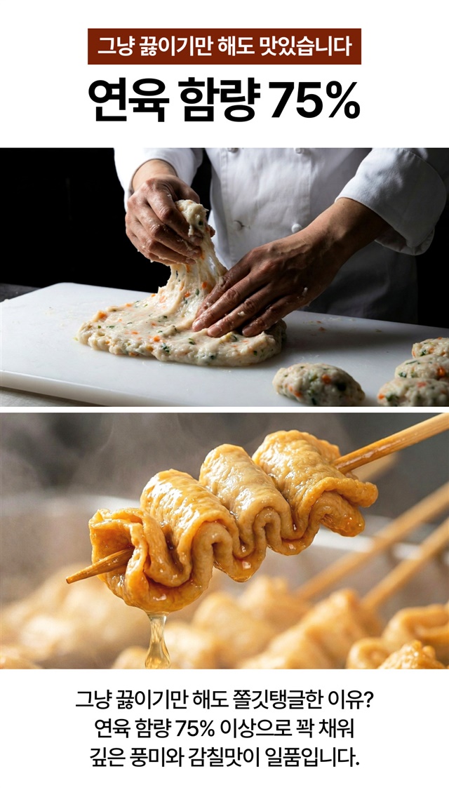 늘 맛있게 잘먹는 가족들 위해 자주 구매합니다. 요즘 처럼 쌀쌀한 날씨에 어묵탕 맛있게 끊여주면 너무 맛있게 먹는 식구들 위해 요리할맛 납니다. 어묵이 쫀득해서 여기제품만 구입합니다